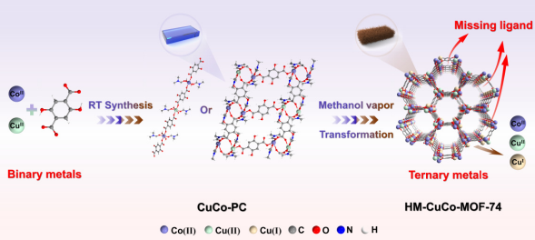 该论文将甲醇蒸气介导的假晶转换策略应用到亚稳态MOFs的结构转化过程,成功构建了一系列兼具超稳定结构和多级孔结构的MTV-MOFs。该策略在实现亚稳态MOF向热力学更稳定晶相结构转化的同时,同步完成了多级孔结构的构筑与多元金属活性位点的引入,实现了MOFs中晶体结构、孔道结构及活性组分的三重协同调控。通过调节亚稳态前驱体中金属离子的比例,可实现多孔结构和催化多功能性的双重调控,为满足特定催化功能需求提供了有效手段。得益于多级孔结构、多元金属活性位点、多级结构以及高稳定性的MOF结构等诸多优势,所得到的HM-CuCo-MOF-74在长效催化和大分子底物催化方面展现出显著优势。基于亚稳态转化的假晶转化策略为设计兼具结构可控性、功能可调性以及催化可持续性非均相催化剂设计提供了全新的思路,有望推动MOFs材料在复杂催化体系中的实际应用。
