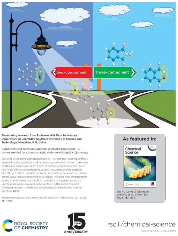 近日,我校化学合成与应用652科研创新研究团队李玉龙教授、贾均松博士在Chemical Science(IF=7.4,TOP期刊,Nature Index期刊,RSC旗舰期刊,中科院1区期刊,JCR1区期刊)上发表题目为“Convergent and divergent synthesis of dihydroisoquinoline-1,4-diones enabled by a photocatalytic skeleton-editing [4+2] strategy”的论文。该研究成果被遴选为Inside back cover论文,我校为通讯单位,李玉龙教授为通讯作者。
